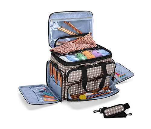 Every knitter has a different choice of where they want to knit their clothes. Some people like spending time outside their house and so they need this knitting bag. You can carry all the knitting materials and tools you need in this bag easily. This bag can also be used to keep all the yarns and other materials in it. This bag is white and beige and has multiple zip full-length pockets. This bag is the perfect gift idea for knitters.