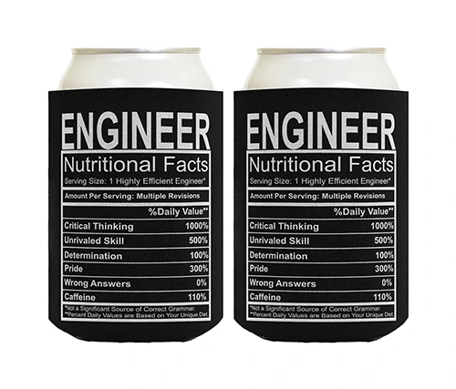 This pack of 2 can coolies will make great gag gifts for an engineer. The black coolies will help to keep the drinks cool. After returning from work or finishing work at home, they might want to pop open a can of beer or cola & relax while watching their favourite shows. The coolies will keep the beverages cold so that they can enjoy sipping on them slowly and will also allow them to hold the cold cans comfortably without their hands getting numb. The design has been printed on both sides for visibility from angles. The coolie cover has a chart of ‘Engineer Nutrition Facts’ much like what you see on health drink labels.